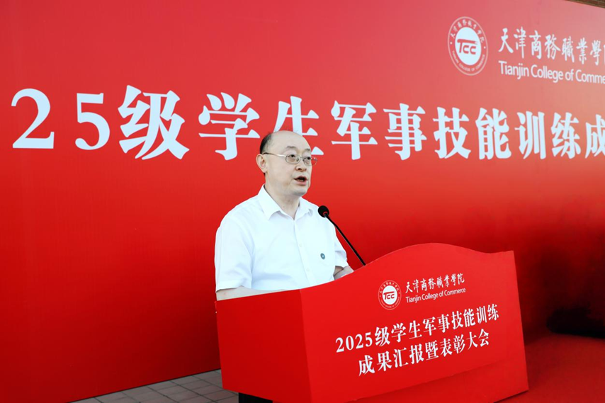 学校党委书记马雷代表学校向“天津警备区、天津市教委、河西区人民武装部和承训武警某部”对学校工作的指导和支持表示感谢,向全体教官和辅导员表示问候,向顺利完成军训任务的2025级学生表示祝贺。他勉励同学们深耕理想沃土,做爱党爱国、志存高远的“奋斗者”;深耕知识沃土,做发愤图强、脚踏实地的“实干家”;深耕人格沃土,做体魄强健、朝气蓬勃的“追光者”。在行业和专业中找到热爱,刻苦学习、精益求精,在拼搏的青春中成就事业华章!