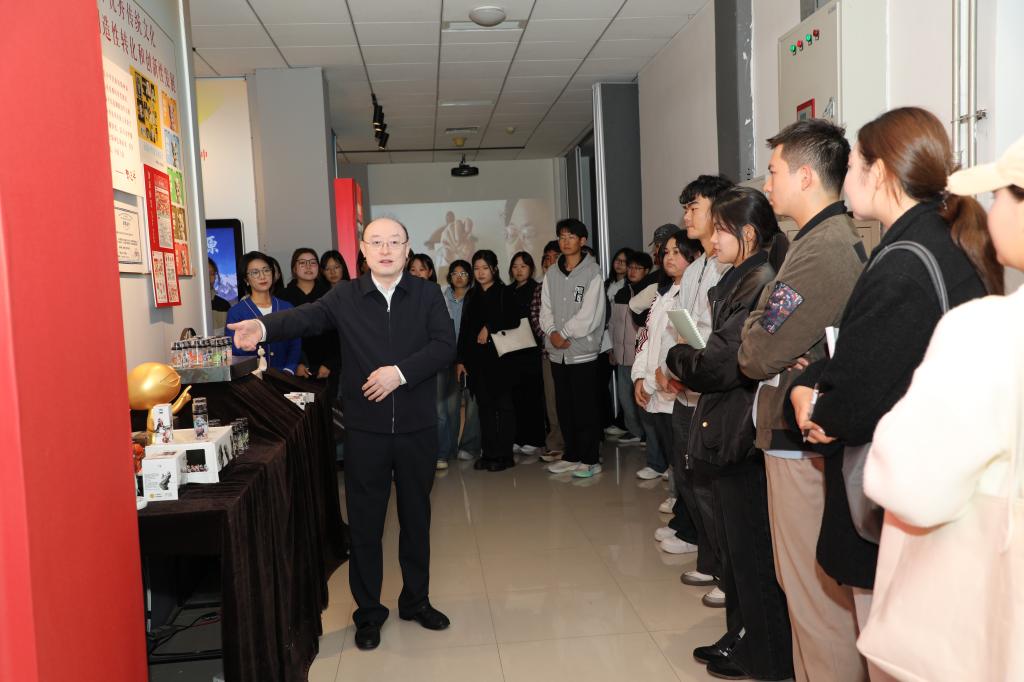 马雷首先向同学们介绍了学校AI+艺术思政协同创新中心的具体情况。在“伟大精神”展区,马雷从艺术性、技术性及思想性等角度向学生们详细讲解了展陈作品,勉励同学们要全面领略中华优秀传统文化的独特魅力,积极运用现代AI技术继承和创新中华优秀传统文化,创作出更多优秀作品。