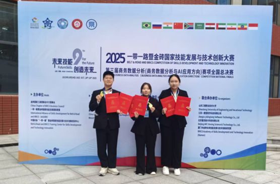 为深入贯彻《国家职业教育改革实施方案》中“强化学生实践能力和可持续发展能力培养”的要求,落实职业教育“以赛促学、以赛促教、以赛促改”核心导向,学校始终将高水平赛事作为锤炼学子专业本领的重要舞台。近日,2025“一带一路”暨金砖国家技能发展与技术创新大赛之第三届商务数据分析(商务数据分析与AI应用方向)赛项全国总决赛落幕,我校商务数据分析与应用专业参赛团队从全国众多精英队伍中突围,成功斩获高职组一等奖(金牌),指导教师张爽、周东朝获评“优秀指导教师”,学校荣获“最佳组织奖”,用实力彰显职教育人成效!